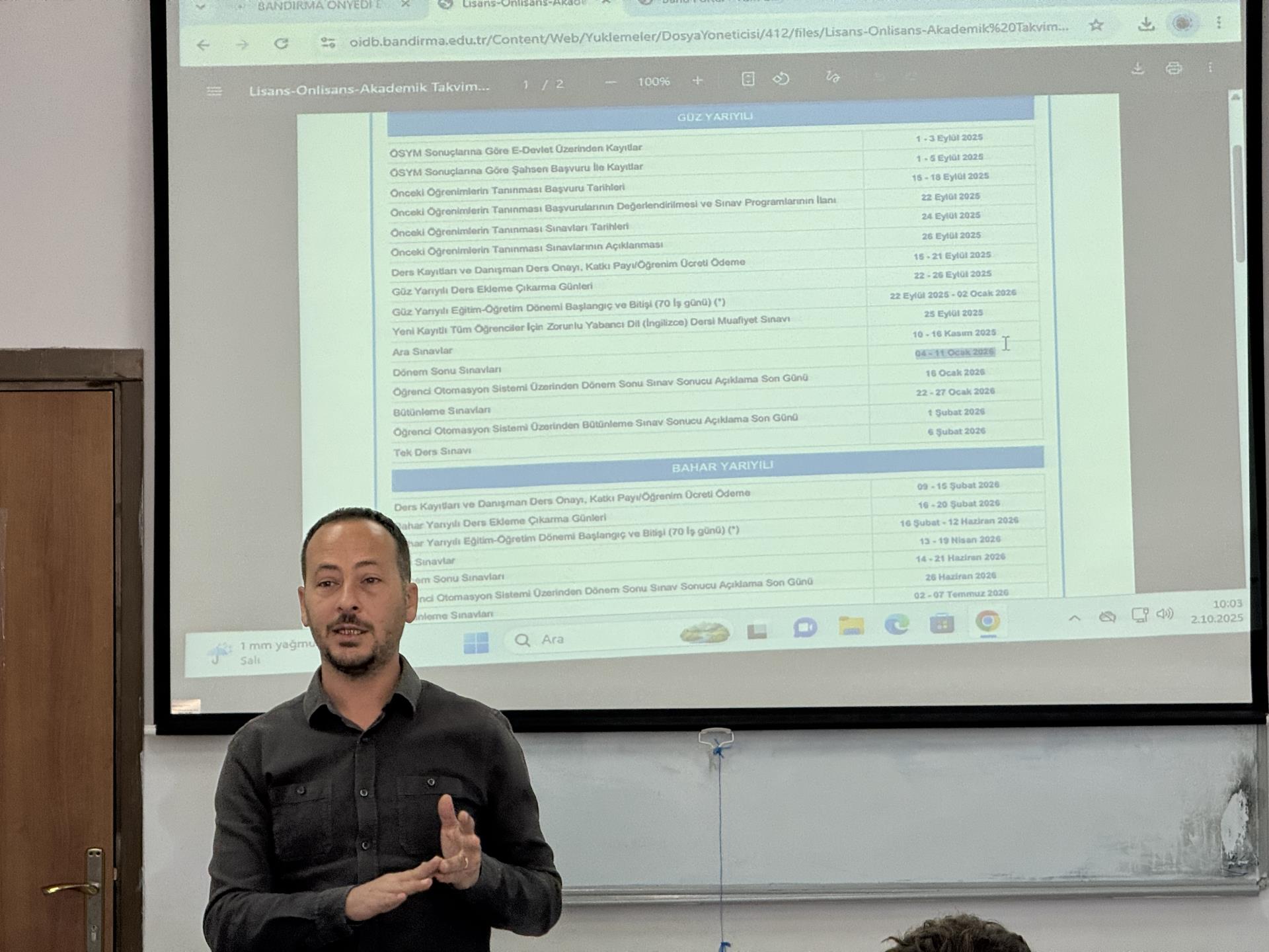 2025-2026 Eğitim-Öğretim yılında yeni kayıt yaptıran öğrencilerimize yönelik oryantasyon programı, 2 Ekim 2025 Perşembe günü gerçekleştirilmiştir. Program kapsamında üniversitemiz ve meslek yüksekokulumuz hakkında genel bilgilendirmeler yapılmış, akademik ve idari süreçler tanıtılmıştır. Ayrıca kalite süreçleri ve öğrencilerimizin bu süreçlere katkısının önemi üzerinde durulmuştur.